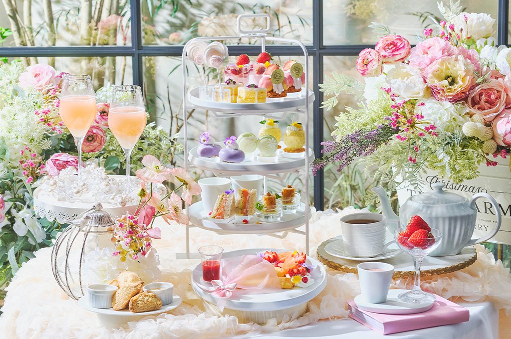春の陽だまりを連想させる、パティシエこだわりのスイーツ7種が登場。バラが香る「いちごとチェリーのヴェリーヌ」や、フレッシュな苺が調和する「いちごのサントノーレ」など、華やかなラインナップをご用意しました。シェフ特製のセイボリーは、ハーブ香るソーセージパイやキャベツのクリームスープなど3種。店内で焼き上げるスコーンは、カモミール香るミルクジャムとともに。 お飲み物はマリアージュフレールも選べる2プランをご用意。さらにオプションとして、旬の果実を包み込んだ「クレープブーケ」や、ピンクガナッシュで楽しむ「フレッシュいちご」も提供。花々が咲き誇るような、心華やぐひとときを。