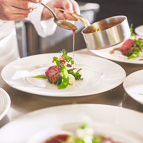 料理長が自ら行う仕上げのソースがけやメニュー紹介など、おもてなしの演出もおすすめ。