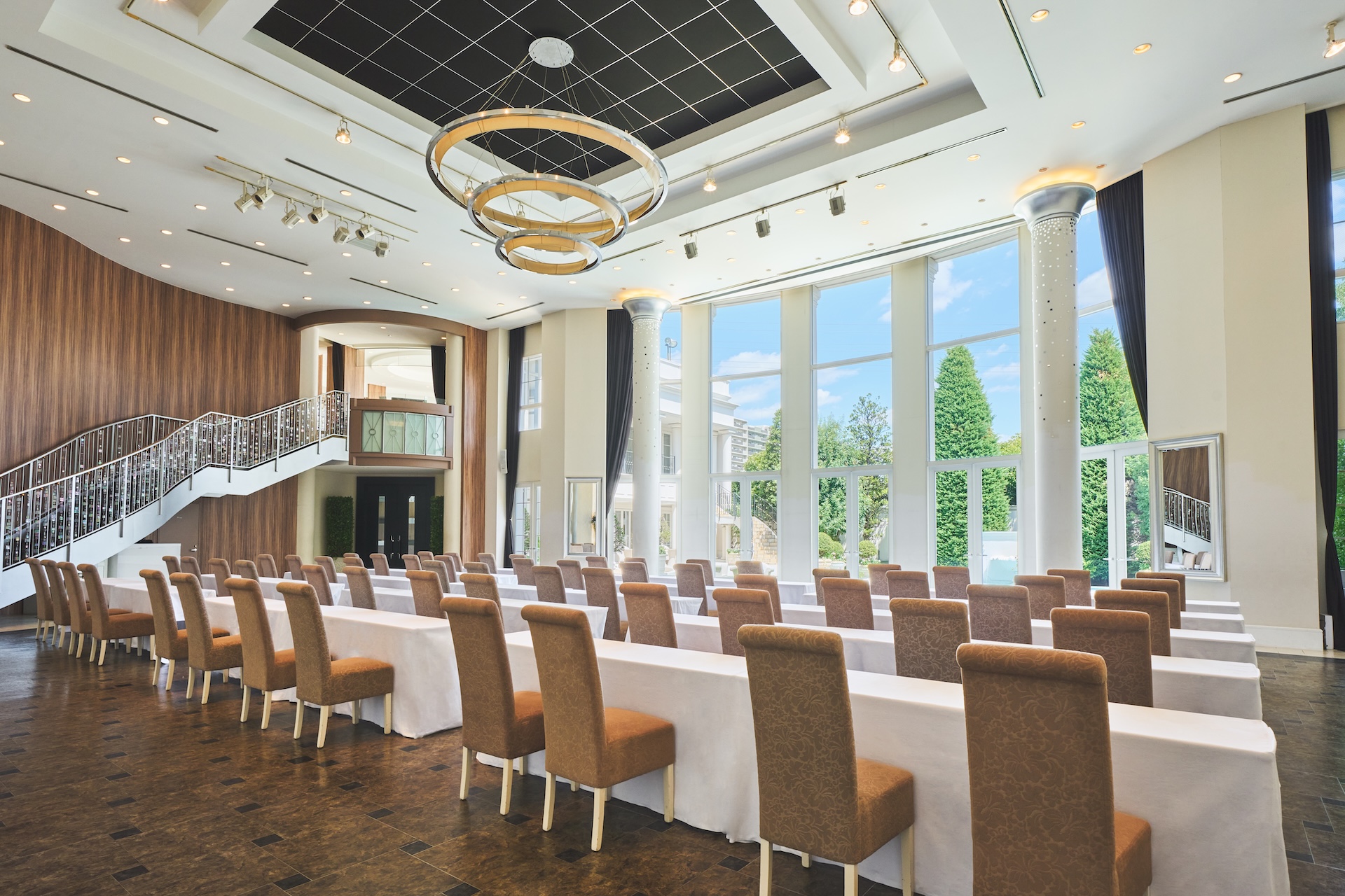 バンケット面積:210㎡ 天井高:5m 立食:30名~200名 着席:30名~150名 スクール:30名~110名 シアター:30名~150名