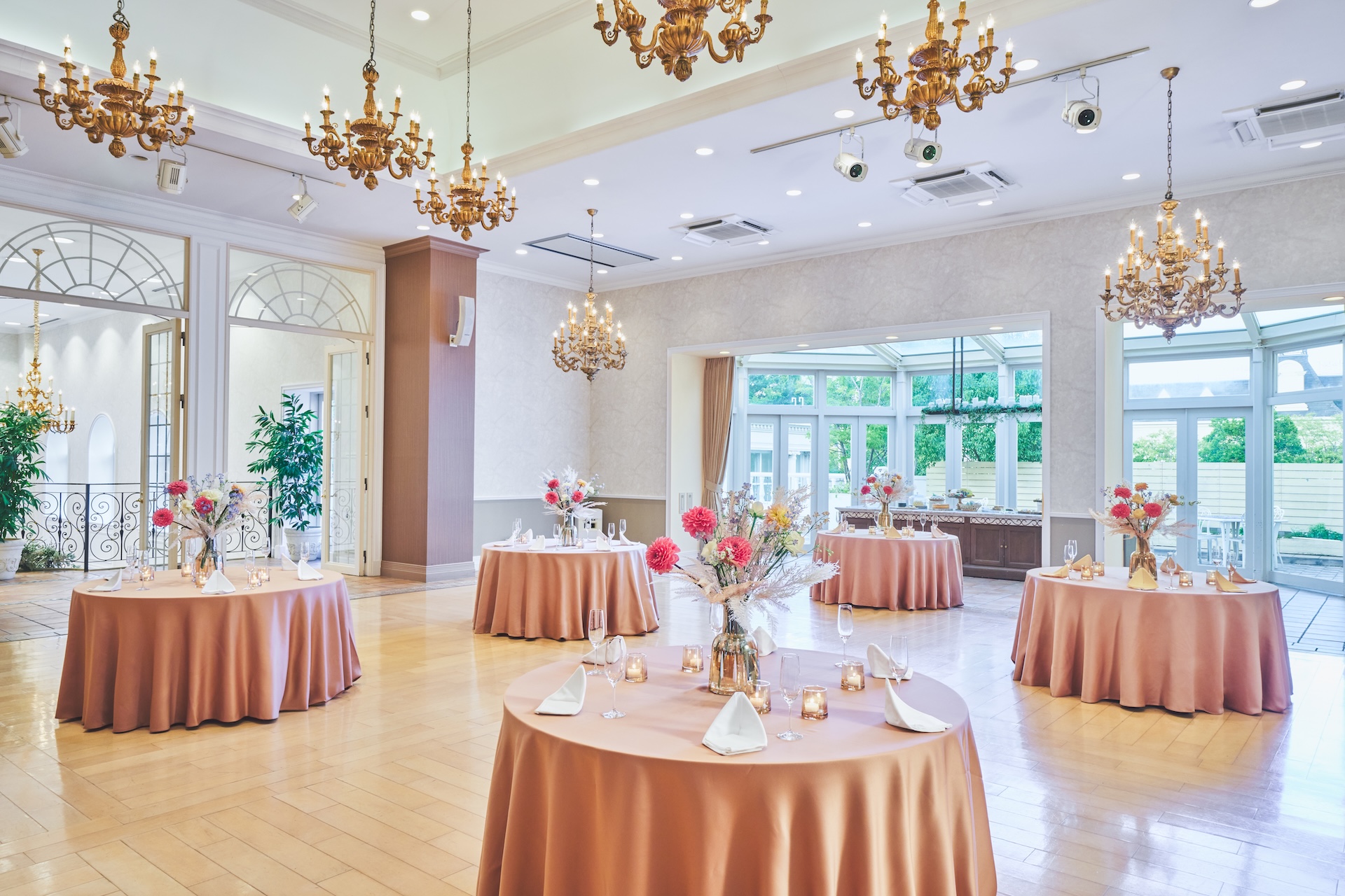 迎賓館ならではの上質な空間を貸し切ってのパーティーが可能です。ガーデン・リビングも使用して、お世話になった方の門出や、新しい仲間を迎えるお祝いの場を演出いたします。