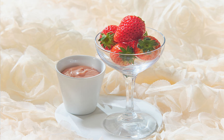 いちご好きにはたまらない、瑞々しいフレッシュのいちごを華やかなピンクガナッシュにディップして楽しむ一品。