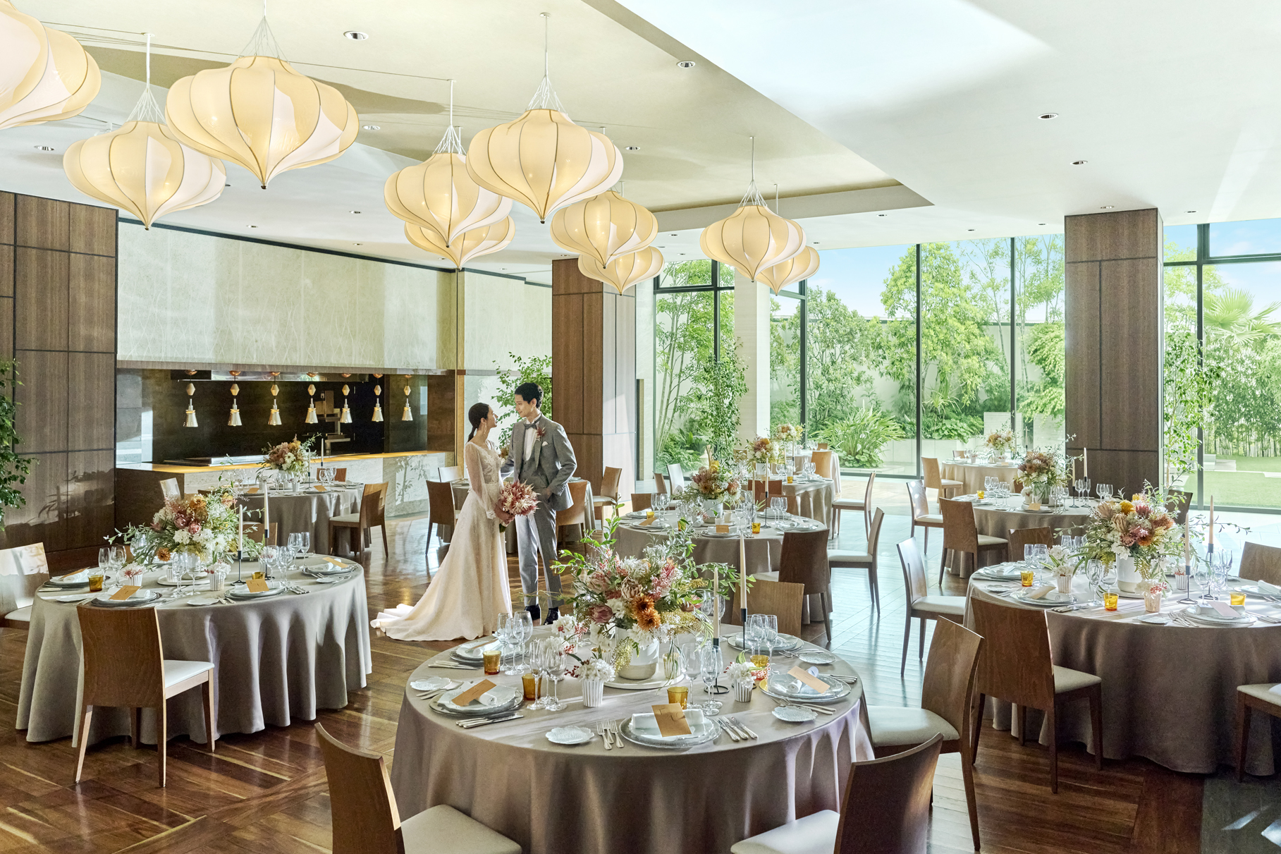 室内でありながらも、フローティングテラスから見える水と緑を背景に自然を楽しめる全天候型バンケット。