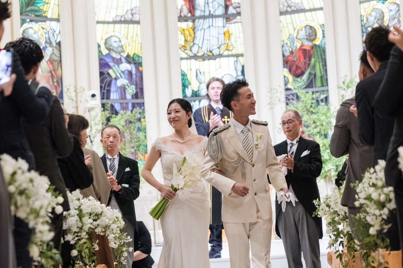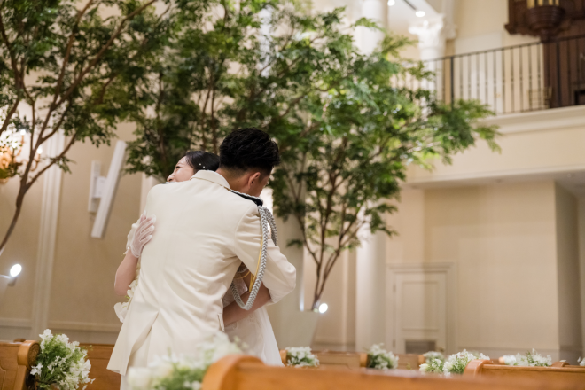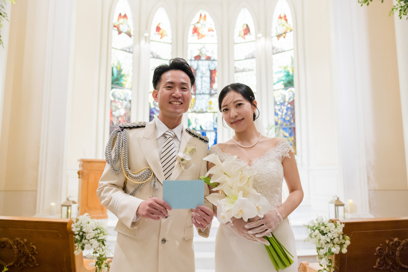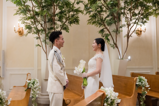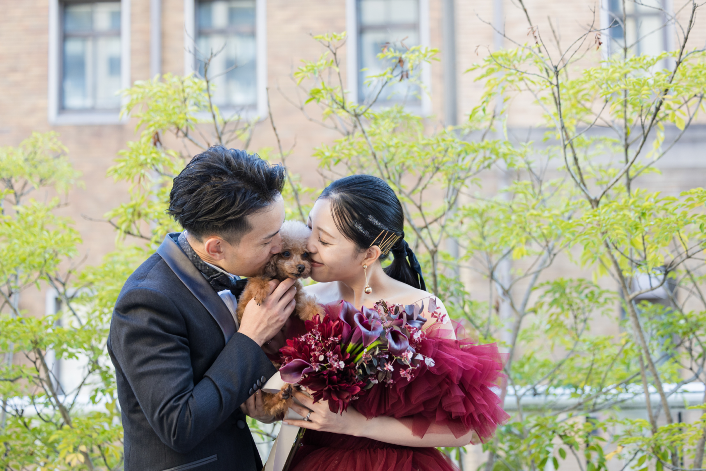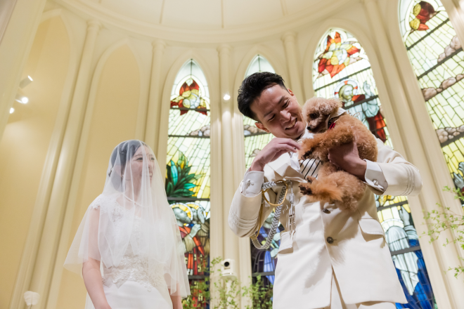 大好きなワンちゃんと一緒に迎える特別な一日 ステンドグラスが輝くチャペルでのセレモニーは、 おふたりらしさがあふれるあたたかな時間に。 大切な家族と過ごす、幸せいっぱいのウェディングです