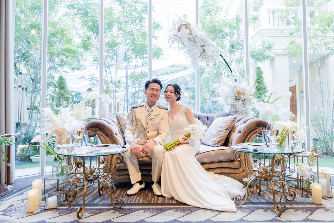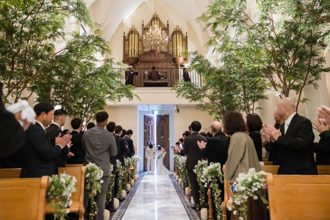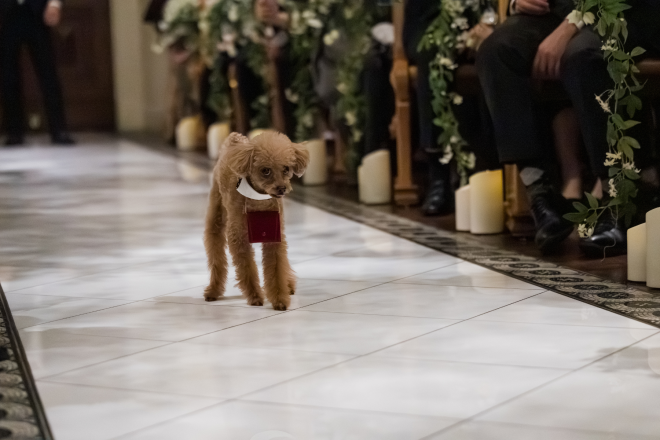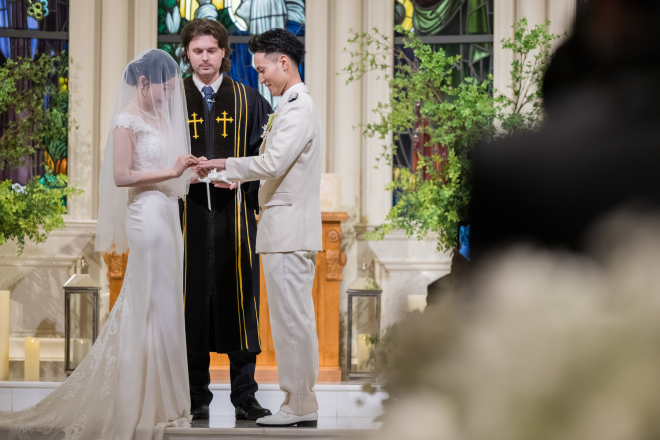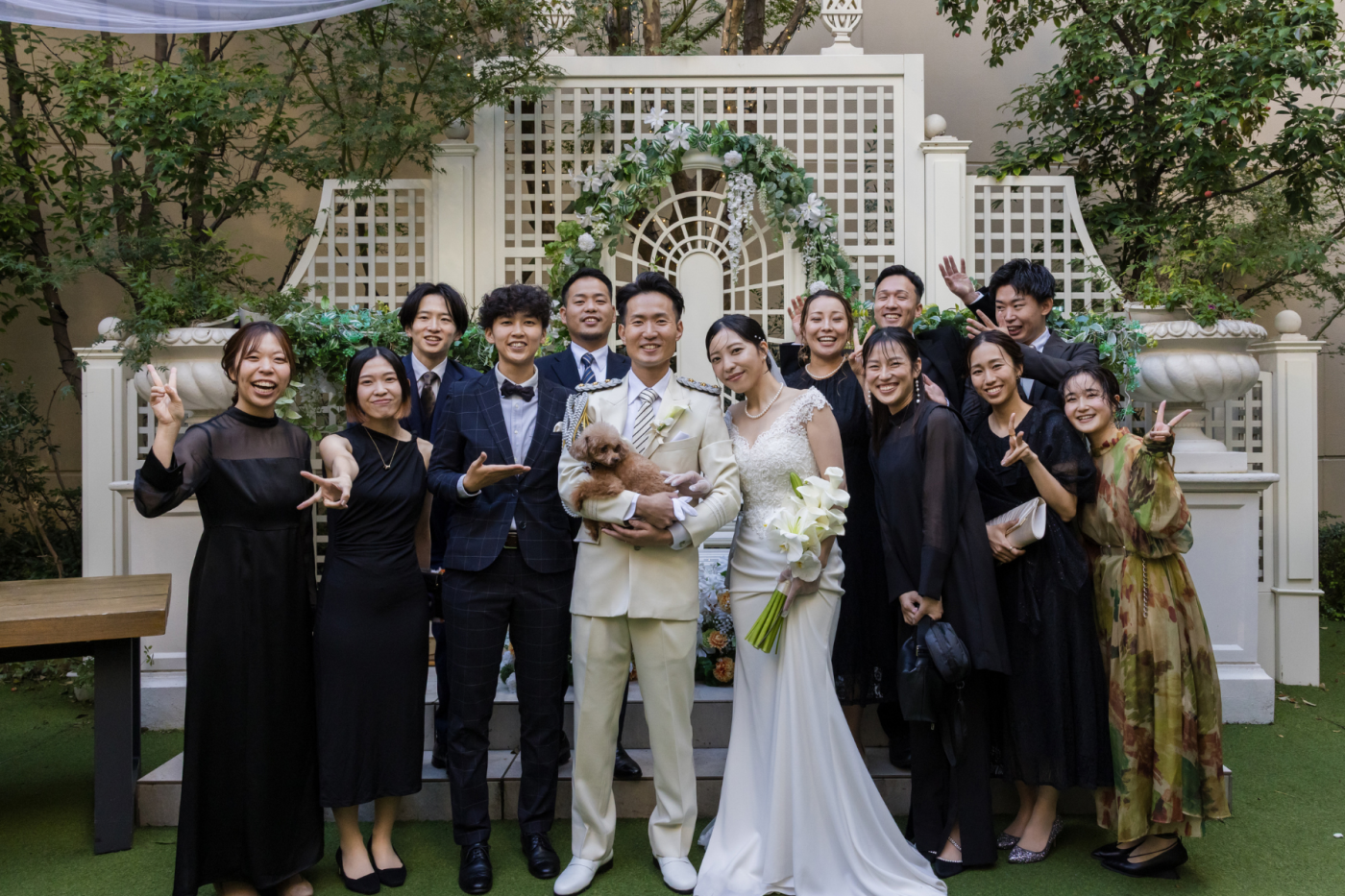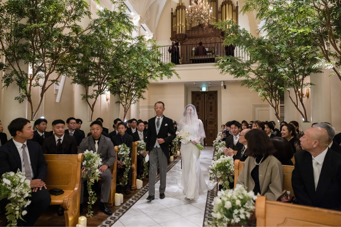 大好きなワンちゃんと一緒に迎える特別な一日 ステンドグラスが輝くチャペルでのセレモニーは、 おふたりらしさがあふれるあたたかな時間に。 大切な家族と過ごす、幸せいっぱいのウェディングです
