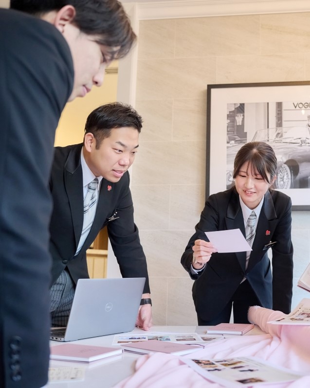 各部門の責任者やスタッフと密にコミュニケーションを取り、連携を取ることを心掛けています。攻めの業務と守りの業務があり、攻めとしては、未来のお客様獲得のため、集客の作戦をたて、見学に来たお客様に当社の結婚式場を選んでいただけるようにフェアの内容を磨き、週次で数字の分析をおこない改善策を実行しています。守りとしては、設備の修繕やメンテナンスを本社と連携して進めること、スタッフとコミュニケーションを取りモチベーションの管理をおこなっています。