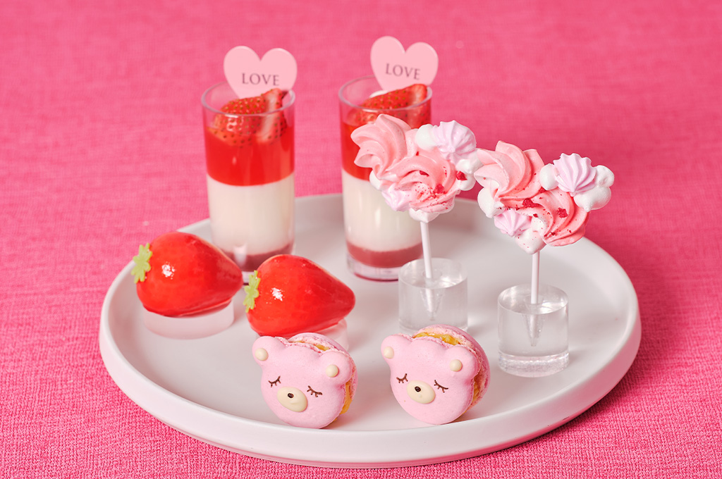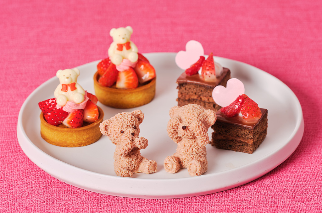 苺のジュレとミルクパンナコッタのグラスデザートをはじめ、まるで本物のいちごに見立てたムース、くまの形に仕上げた爽やかなベルガモットの風味が広がるくまマカロン、思わず写真に撮りたくなる、くまモチーフのスイーツ7種をご用意。また、すやすや居眠りするくまに心ときめく、大人のショコラムース『夢見るくまのオレンジショコラムース』 をスペシャルデザートで販売。ほろ苦いキャラメルバナナと爽やかなオレンジのジュレを濃厚なショコラムースで優しく包み込み、思わず抱きしめたくなる居眠りするくまの愛らしい姿に仕上げた、目にも美味しい心ときめくスペシャリテです。