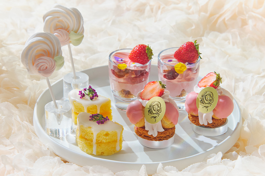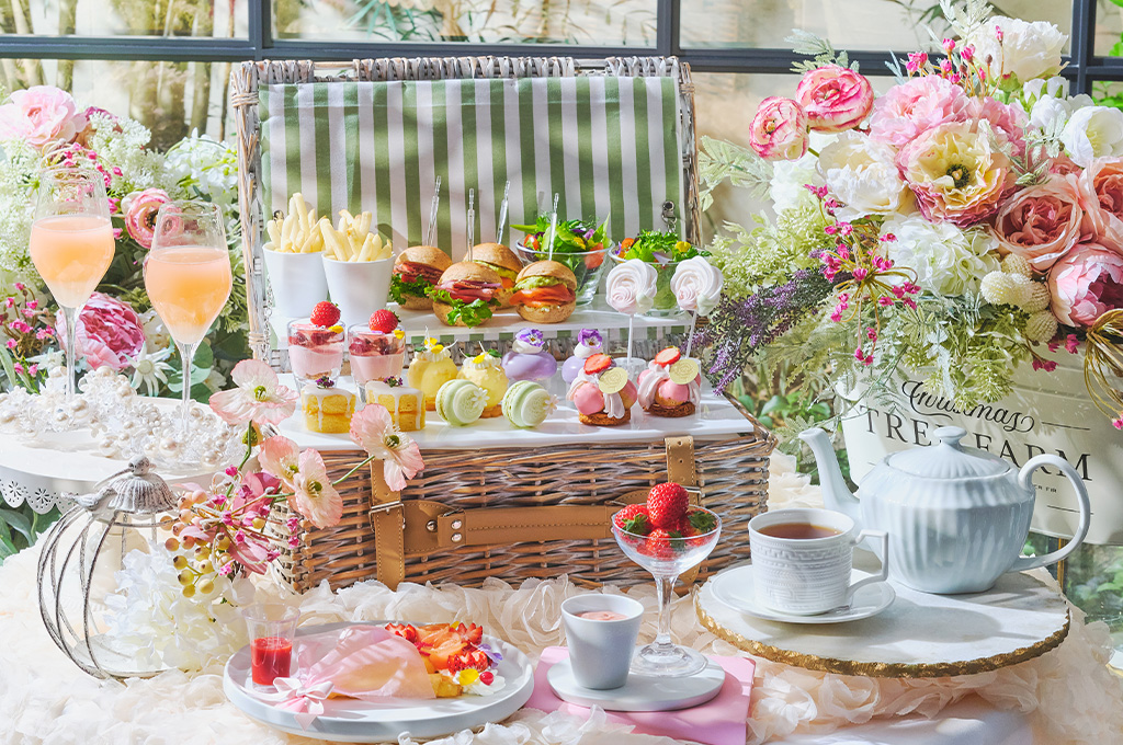 春の陽だまりを連想させる、パティシエこだわりのスイーツ7種が登場。バラが香る「いちごとチェリーのヴェリーヌ」や、フレッシュな苺が調和する「いちごのサントノーレ」など、華やかなラインナップをご用意しました。シェフ特製のセイボリーは、ハーブ香るソーセージパイやキャベツのクリームスープなど3種。店内で焼き上げるスコーンは、カモミール香るミルクジャムとともに。 お飲み物はマリアージュフレールも選べる2プランをご用意。さらにオプションとして、旬の果実を包み込んだ「クレープブーケ」や、ピンクガナッシュで楽しむ「フレッシュいちご」も提供。花々が咲き誇るような、心華やぐひとときを。