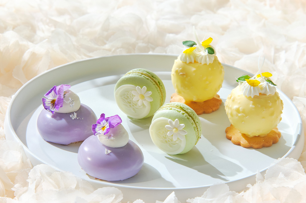 春の陽だまりを連想させる、パティシエこだわりのスイーツ7種が登場。バラが香る「いちごとチェリーのヴェリーヌ」や、フレッシュな苺が調和する「いちごのサントノーレ」など、華やかなラインナップをご用意しました。シェフ特製のセイボリーは、ハーブ香るソーセージパイやキャベツのクリームスープなど3種。店内で焼き上げるスコーンは、カモミール香るミルクジャムとともに。 お飲み物はマリアージュフレールも選べる2プランをご用意。さらにオプションとして、旬の果実を包み込んだ「クレープブーケ」や、ピンクガナッシュで楽しむ「フレッシュいちご」も提供。花々が咲き誇るような、心華やぐひとときを。