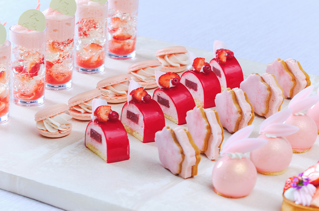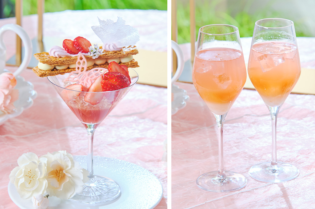 スイーツは、シャンパンが香るいちごのヴェリーヌや桜香るいちごタルトなど、パティシエ渾身の6種をご提供。桜餡のバタークリームをサンドした可愛らしいクッキーなど、細部まで春を象った逸品が並びます。さらに、桜と蝶のチュイールを飾った「ミルフィーユ仕立てのスペシャルパフェ」が、テーブルを華やかに彩ります。目でも舌でも「お花見気分」を満喫する、至福のひとときを。大切な方との語らいや、自分へのご褒美に、春爛漫のひとときをお届けします。