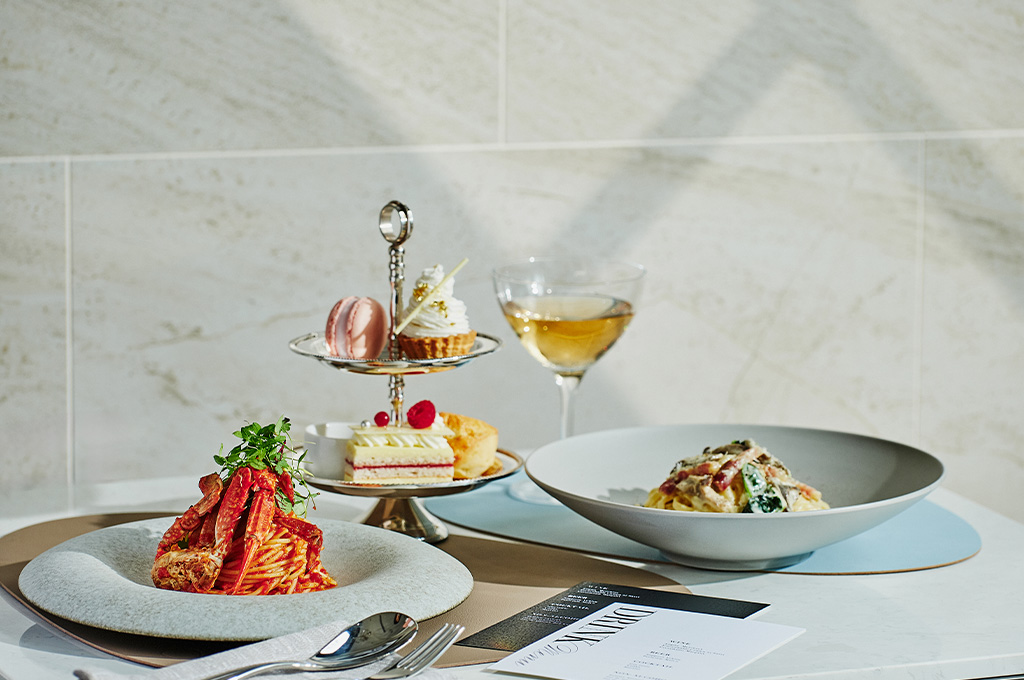 ランチタイムに小さなご褒美を。平日限定でパスタランチセットをご用意しました。 季節の風味豊かなポタージュと、カリッと揚がったポテトが付いた、心満たされるランチプレートです。さらに、当店のパスタランチは食後のデザートにもこだわり、特別なセットプランをご用意しています。ミニサイズのアフタヌーンティーやパフェ、また、マカロンケーキやナンバーケーキなどのアイコニックなスイーツからお選びいただけます。 美味しいパスタと贅沢なスイーツで、ゆったりとしたひとときをお過ごしください。