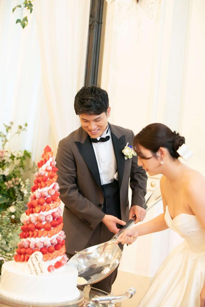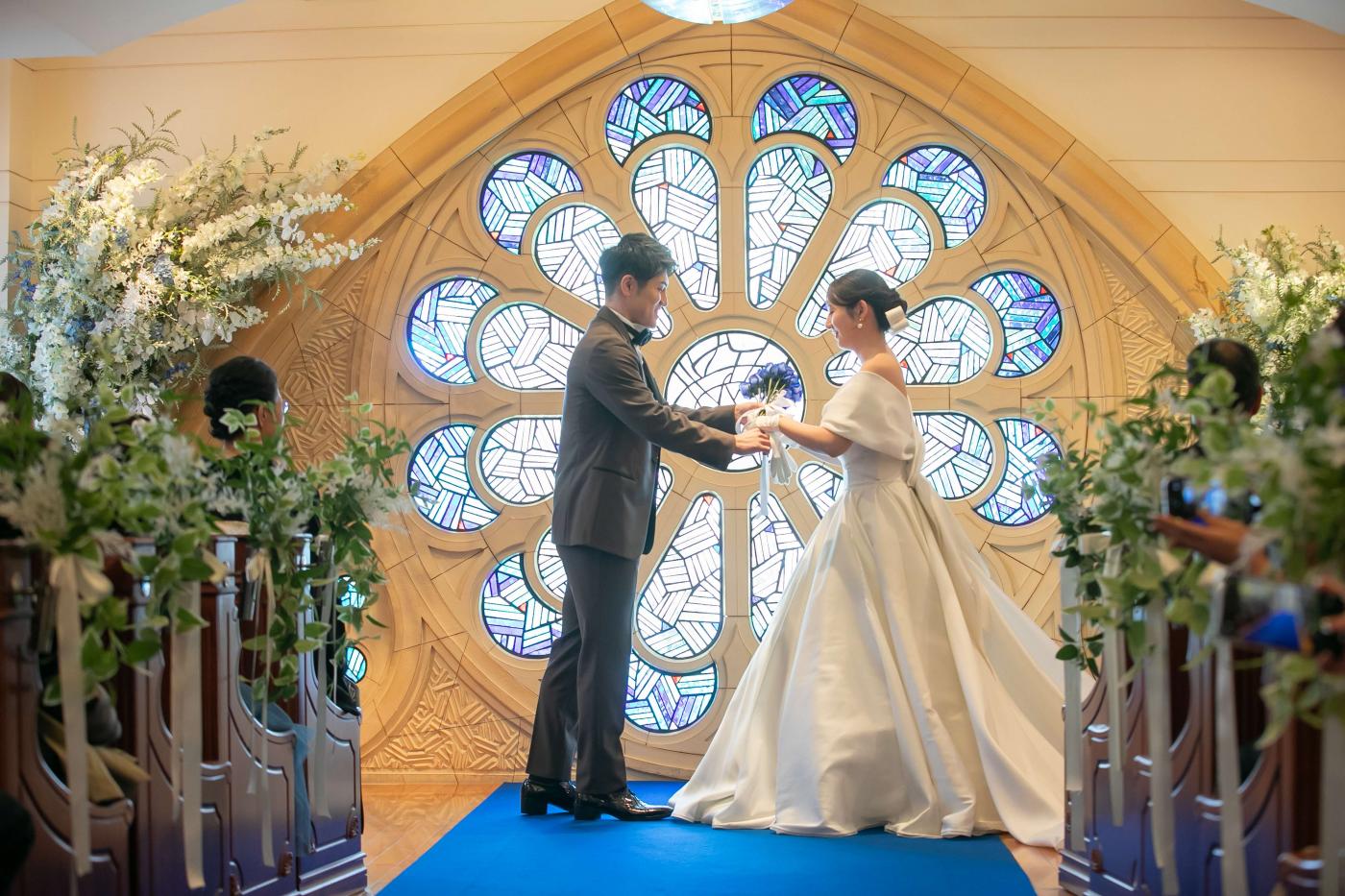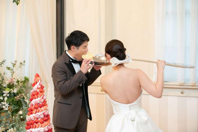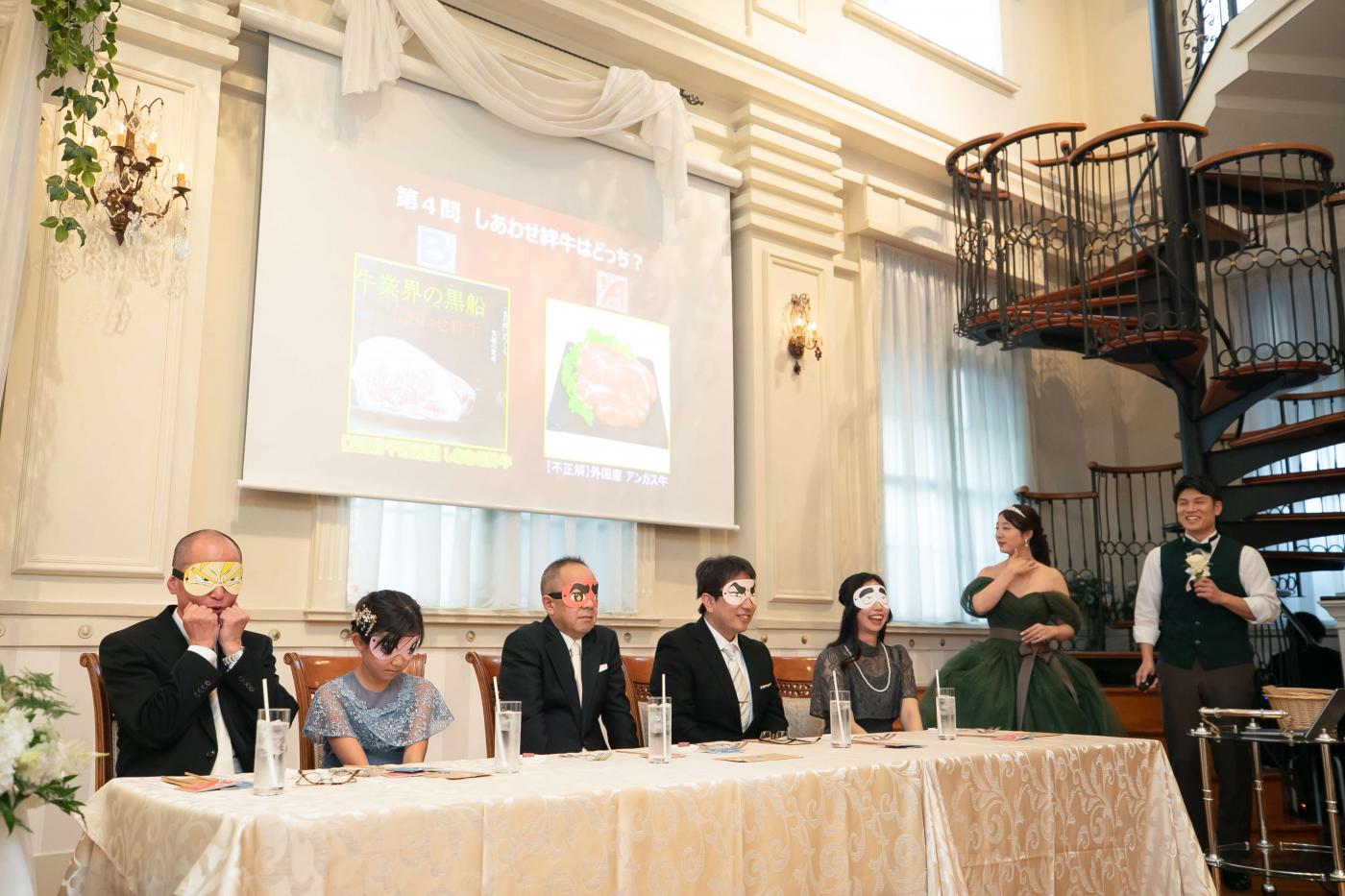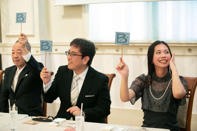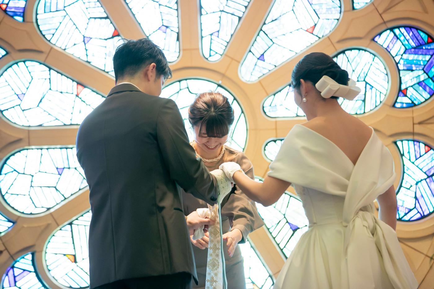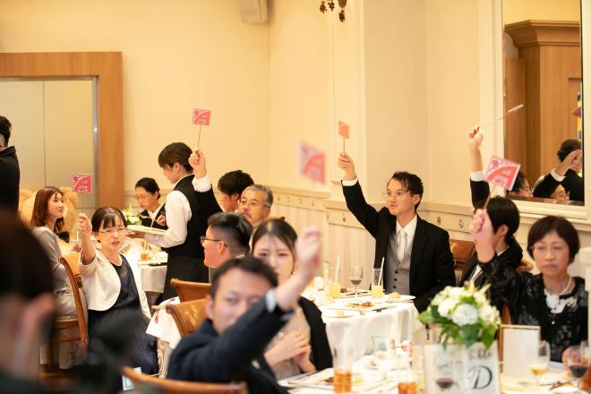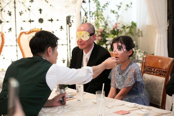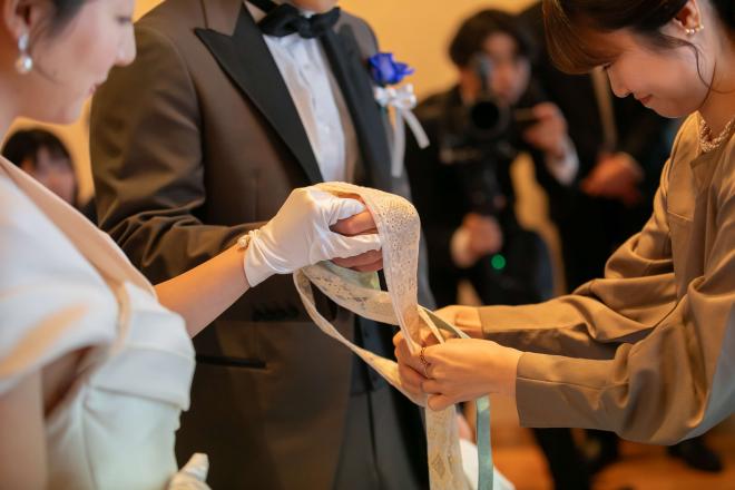 挙式の際に、指輪交換ではなく<ハンドファスティング>をおススメ。ヨーロッパでは伝統的なセレモニーとし人気。おふたりの手をリボンで結び夫婦がひとつになる事を象徴するセレモニー!披露宴パーティーでは参加型のイベントで格付けチェックを提案!トーナメント戦にして全員が参加する盛り上がるシーンに。