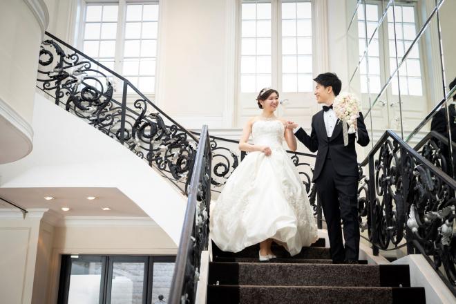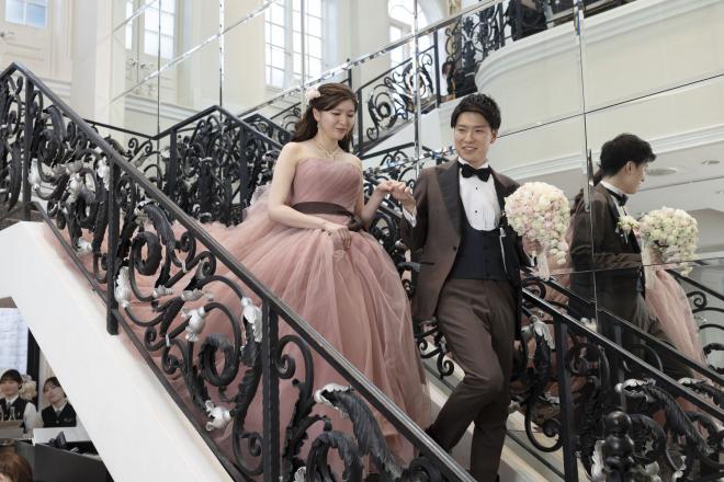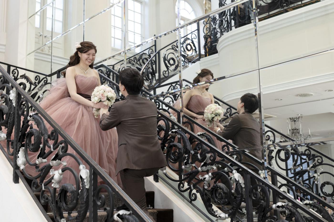 階段の上で待つ新婦のもとへ、新郎が一歩ずつ歩み寄り、ブーケを手に想いを伝える“ブーケプロポーズ”のシーンは、