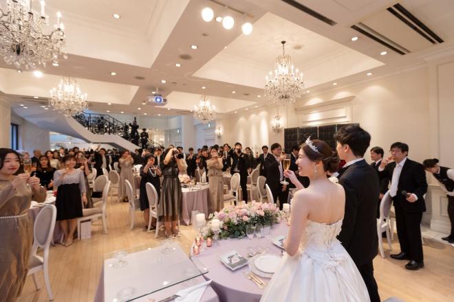 お色直しでは、大人可愛いピンクのドレスに身を包んだ新婦が登場し、その美しさにゲストからは思わず歓声が上がります。