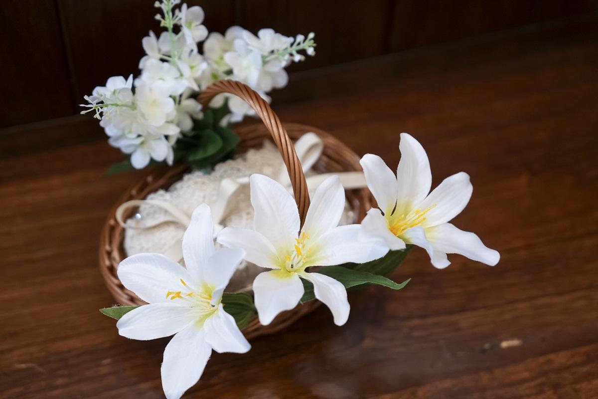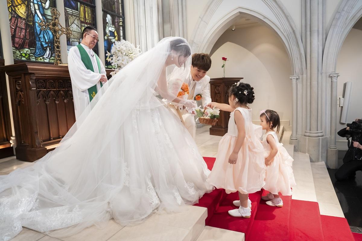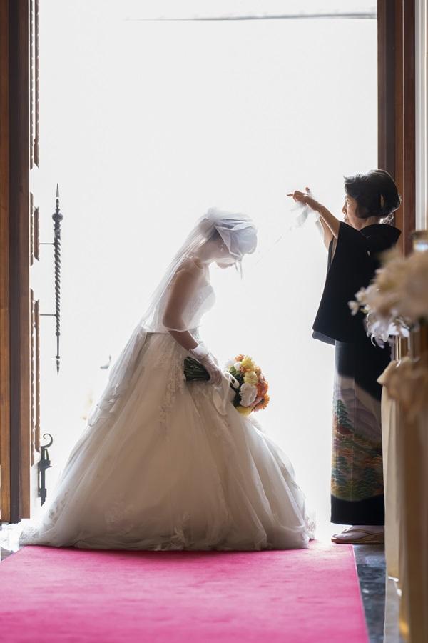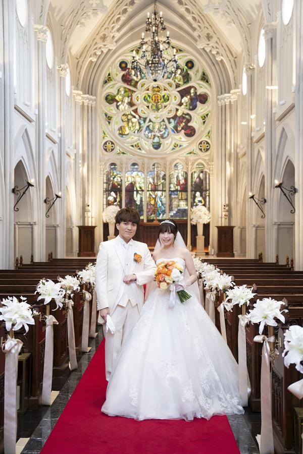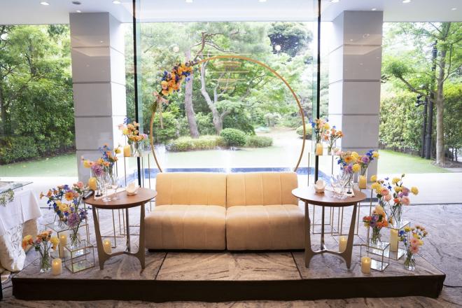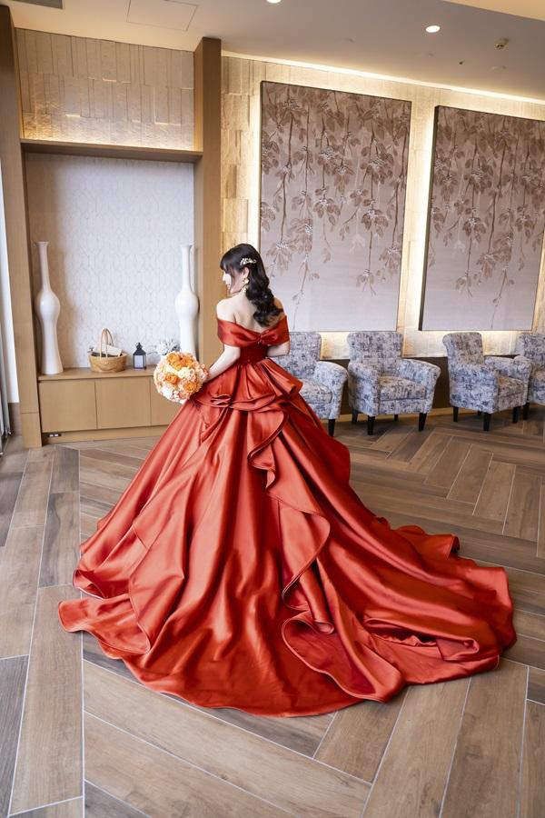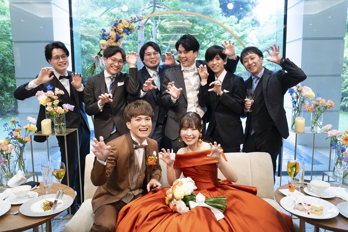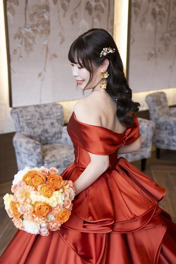 オレンジをテーマカラーにした装花や衣裳は、明るく前向きな私たちらしさの象徴。