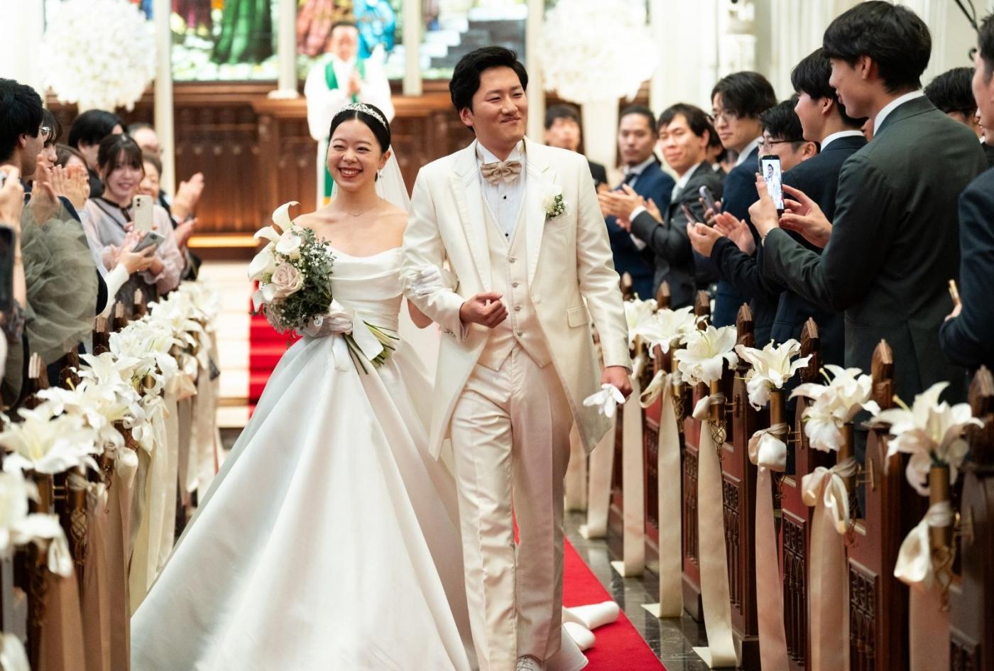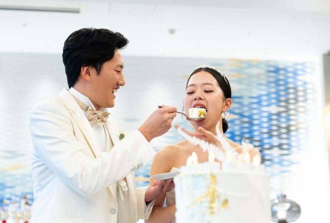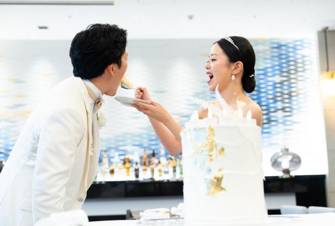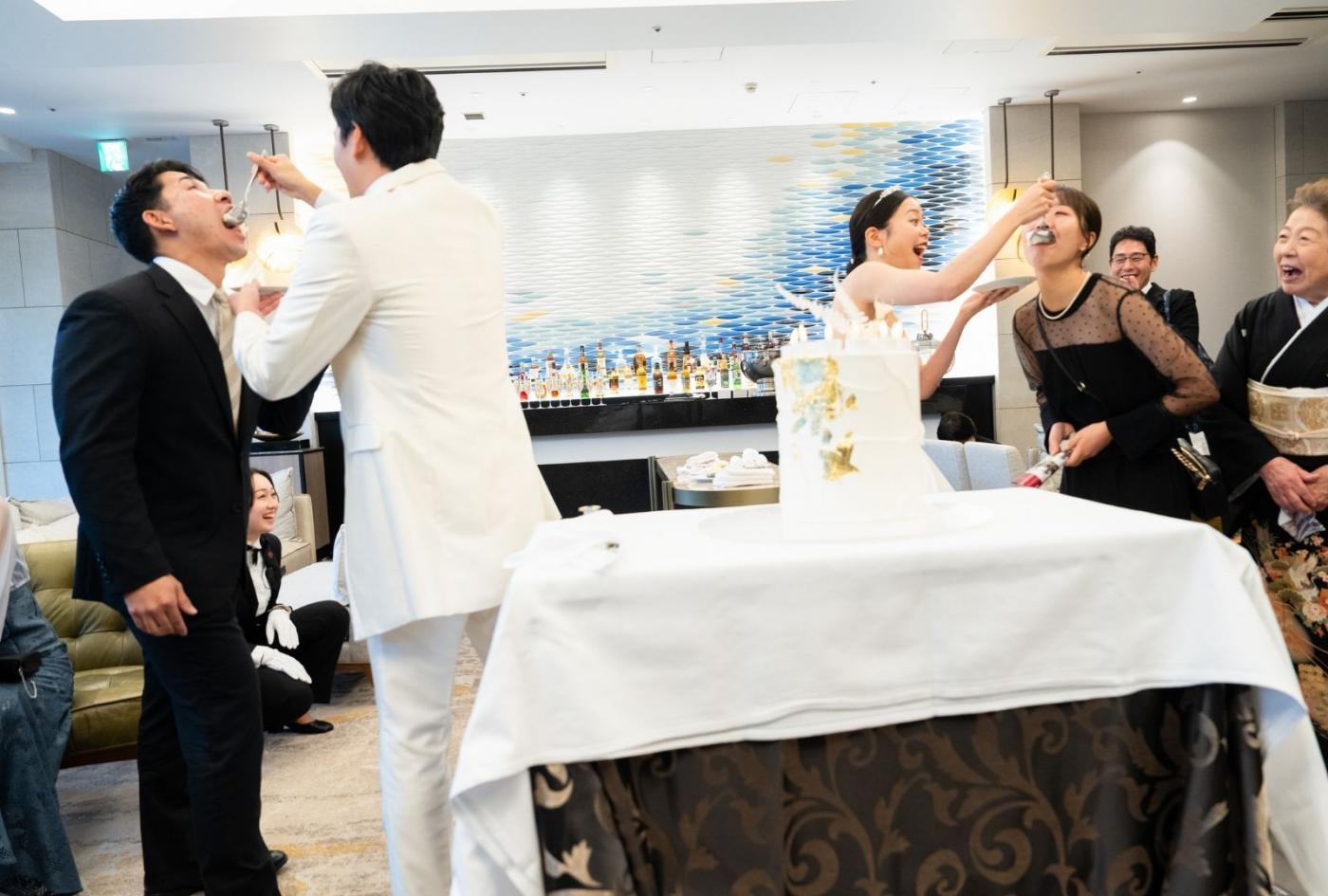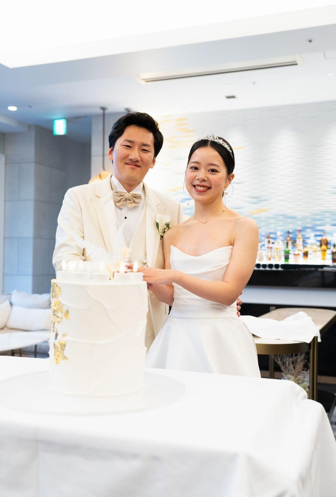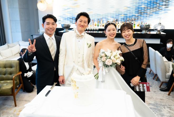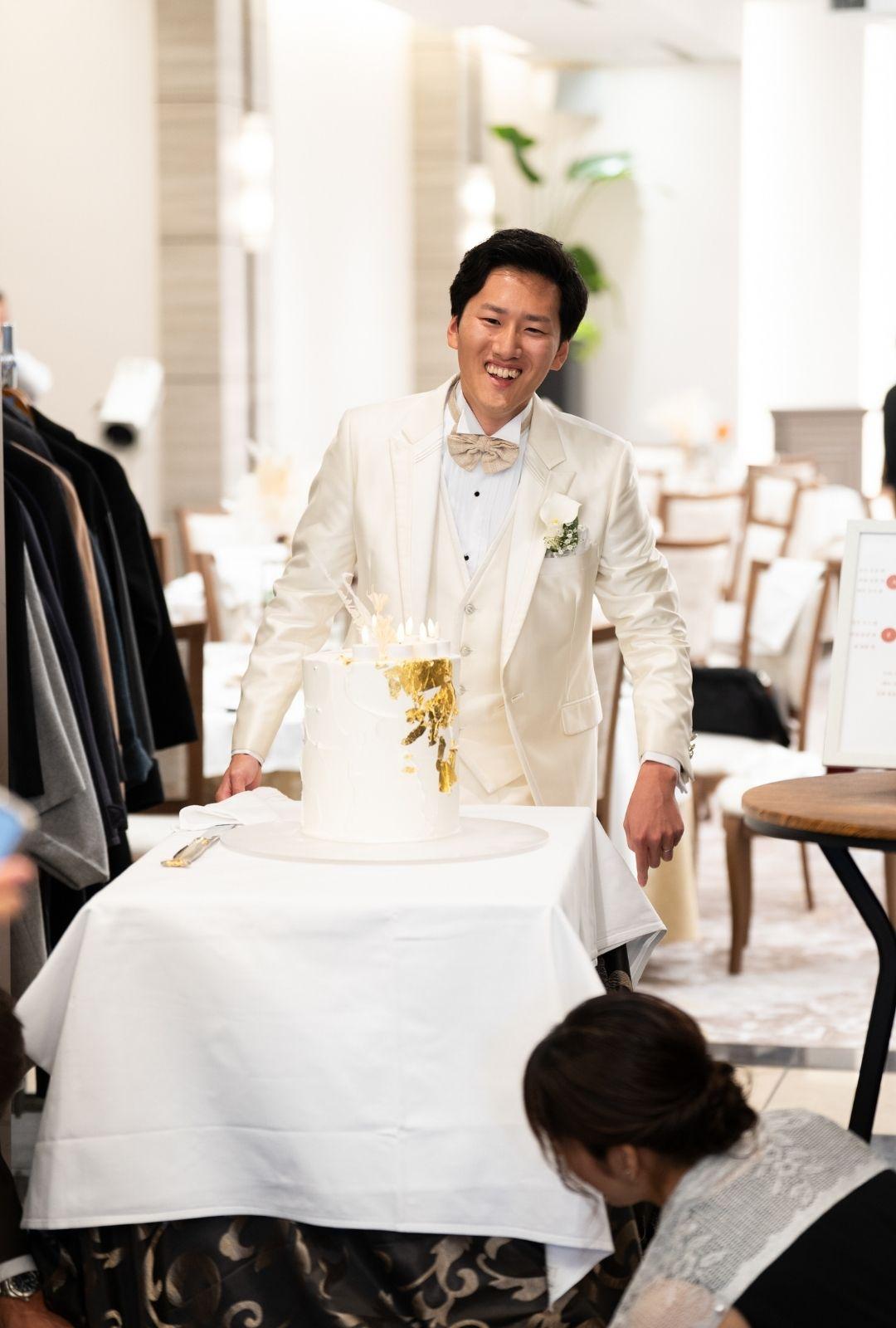 タキシード、ドレス、そしてケーキに至るまで潔い「白」で統一。