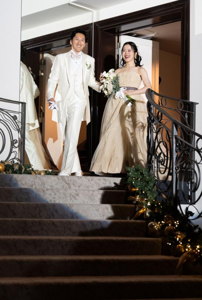 階段からお色直しをされたおふたりのご入場です。